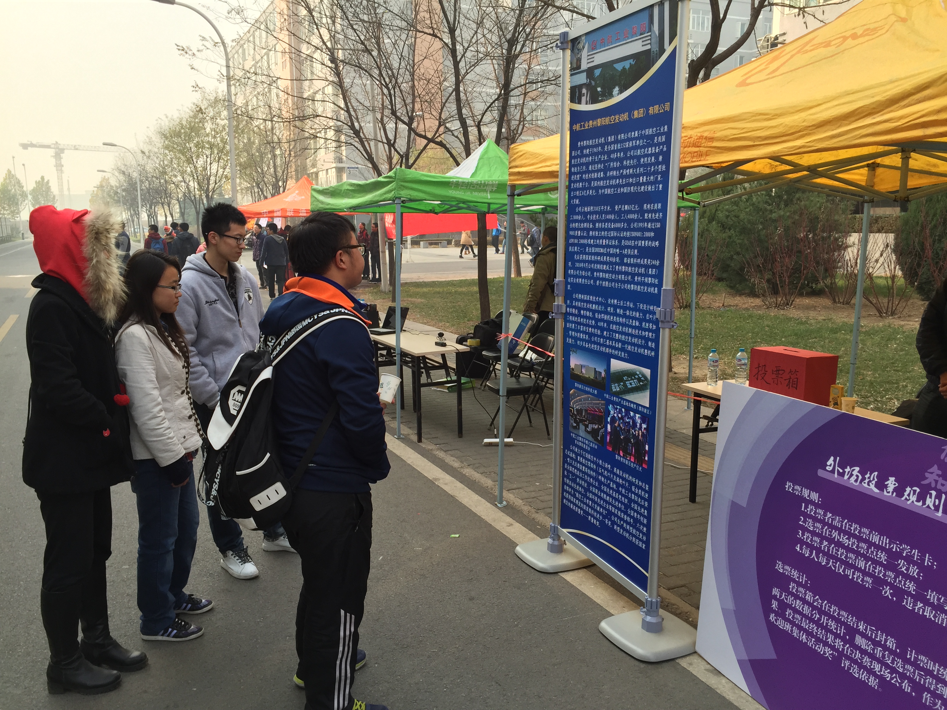 “中航黎阳杯” 艾弗森贝博ballbet官网2014级本科新生最佳班集体活动答辩赛外场展示于11月19日与20日在沙河校区1,4号学生公寓楼之间开展,参加本次外场展示的是晋级决赛的十四个班级。