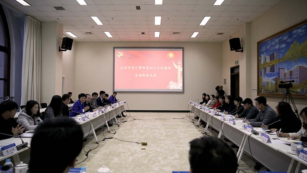 随后,北京市学习贯彻党的十九大精神宣讲团座谈会在航空馆二层会议室举行,北京高校十佳辅导员代表、北京高校理论社团学生负责人等共30人参加会议。北航习近平新时代中国特色社会主义思想学习研究会负责人薛嘉成作为北京高校理论社团学生负责人代表参加座谈会,并介绍了北航学生在学习习近平新时代中国特色社会主义思想和党的十九大精神方面的情况。