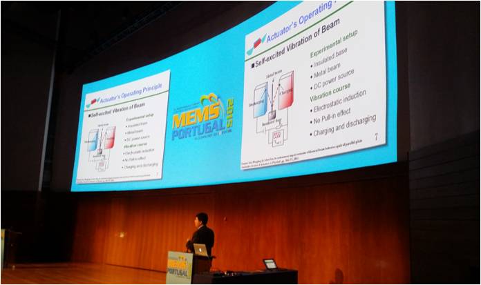 2015年1月18日-1月22日,IEEE第28届国际微机电系统会议(International Conference on Micro Electro Mechanical Systems,简称MEMS 2015)在葡萄牙Estoril举行。在会议开幕的当天上午,我院闫晓军教授做了题为《Self-Lifting Artificial Insect Wings via Electrostatic Flapping Actuators》的大会报告(作者:Xiaojun Yan, Mingjing Qi, Linwei Lin),介绍了我校与加州大学Berkeley分校合作研制的微扑翼静电驱动器(图1)。该驱动器采用直流电压作为输入,驱动蜜蜂翅膀产生与昆虫非常相似的扑翼运动,产生的升力能够克服扑翼结构的自身重力,实现了其在导轨上的向上飞行。